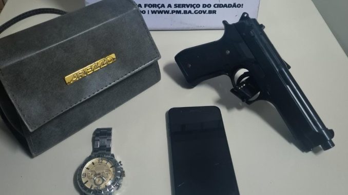 Durante a abordagem aos suspeitos, foi encontrada uma réplica de pistola, uma bolsa, um aparelho celular e um relógio.