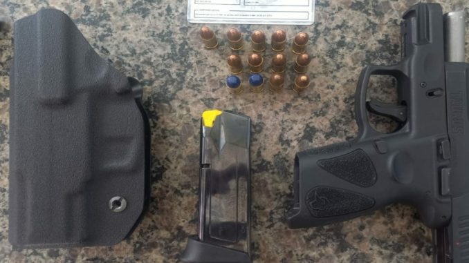 No decorrer da abordagem e busca pessoal ao indivíduo, foi encontrada com ele uma pistola Taurus calibre 9mm.