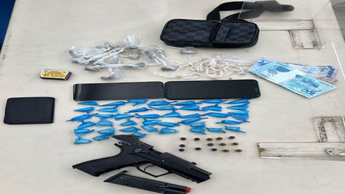 Na manhã desta quinta-feira (26), policiais militares da 10 CIPM detiveram dois suspeitos de tráfico e apreenderam uma motocicleta roubada, arma e drogas, em Candeias Durante a Operação Força Total, as guarnições realizavam rondas na