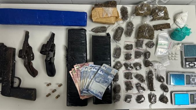 Entre os itens apreendidos estavam diversas porções de maconha e cocaína, balanças de precisão e três armas de fogo, incluindo dois revólveres e uma pistola com numeração suprimida, além de munições intactas e dinheiro em espécie.