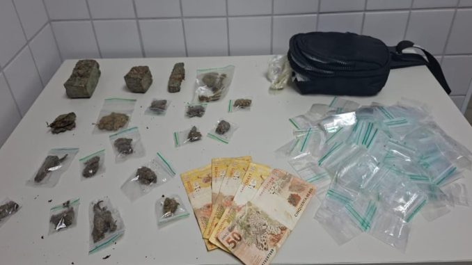 Com o suspeito, os militares encontraram quatro pedaços e 15 embalagens contendo substância análoga à maconha, já preparadas para venda. Além disso, os agentes apreenderam um iPhone 13, uma bolsa preta, R$ 130 em dinheiro e diversas embalagens utilizadas para armazenamento de drogas.