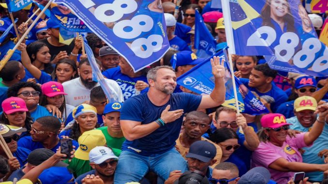 O candidato a prefeito de Camaçari, Flávio Matos (União Brasil), arrastou uma enorme multidão na Av. 28 de Setembro, neste sábado (28), data que marca o aniversário de 266 anos de Camaçari. O arrastão do “time azul” saiu logo após o desfile cívico, que encerrou por volta de 13h.