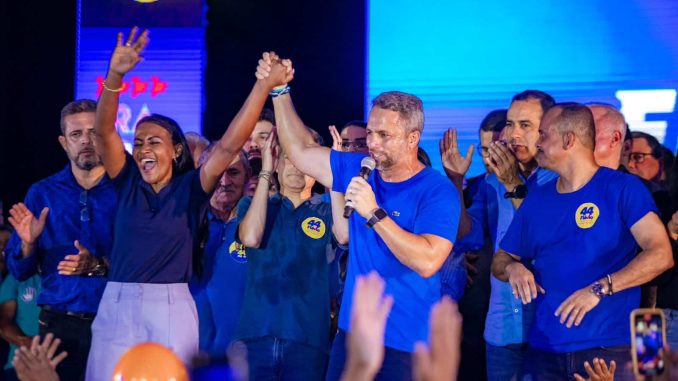 Agora é oficial! Flávio Matos (União Brasil) e Angélica Bittencourt (Progressistas) foram confirmados como candidatos a prefeito e vice-prefeita de Camaçari, durante a Convenção Partidária realizada na noite desta quarta-feira (24), no Clube Social e Desportivo, localizado na Avenida Jorge Amado, no bairro Novo Horizonte. O evento reuniu milhares de pessoas e contou com a presença de figuras ilustres, como o vice-presidente do União Brasil e ex-prefeito de Salvador, ACM Neto, além do atual prefeito de Camaçari, Elinaldo Araújo. Também marcaram presença gestores municipais, deputados estaduais e federais, lideranças partidárias, vereadores e candidatos dos partidos aliados.