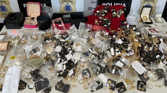 Seiscentos e dez pares de brincos, 52 pulseiras, 90 conjuntos de brincos e argolas, 80 alianças, 140 anéis, 65 cordões, três braceletes, dois pingentes, um relógio e 200 peças avariadas foram apreendidos com um homem. Ele levava as joias dentro de uma mochila, quando foi abordado pelos policiais nas imediações do Terminal Rodoviário de Feira de Santana.