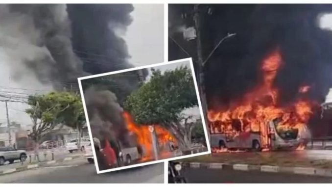 Um ônibus do sistema BRT pegou fogo na manhã desta terça-feira (22), em Feira de Santana, nas proximidades do Boulevard Shopping, na Avenida João Durval Carneiro. O veículo estava parado em frente a uma das estações do transporte quando as chamas começaram a se espalhar rapidamente pelo interior do coletivo.