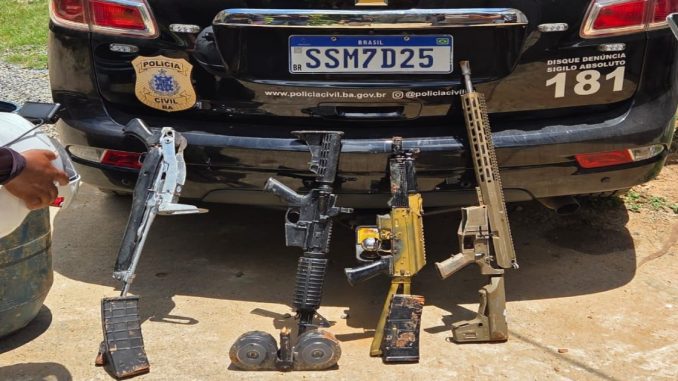 A Polícia Civil da Bahia apreendeu três fuzis, uma espingarda calibre 12, carregadores tipo caracol e uma grande quantidade de drogas durante uma operação no bairro do Arenoso, em Salvador. A ação faz parte da