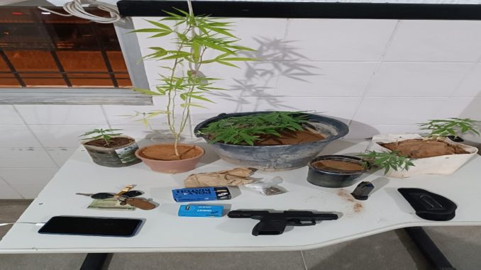 Os militares faziam rondas no bairro Mota, na zona urbana do município, quando avistaram dois homens em atitude suspeita em um carro. Foi dada a voz de parada e, na abordagem, foram encontradas uma pistola, sete pés de maconha, dez pés de cocaína e 103 munições de diversos calibres.