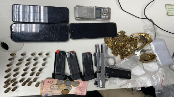 Ao realizara abordagem foram encontradas com o suspeito, uma pistola calibre 40 mm com três carregadores e 37 munições, três celulares, oito anéis, três pedras de cocaína, duas porções da mesma substância, uma balança de precisão, embalagens vazias para acondicionar drogas e dinheiro em espécie.