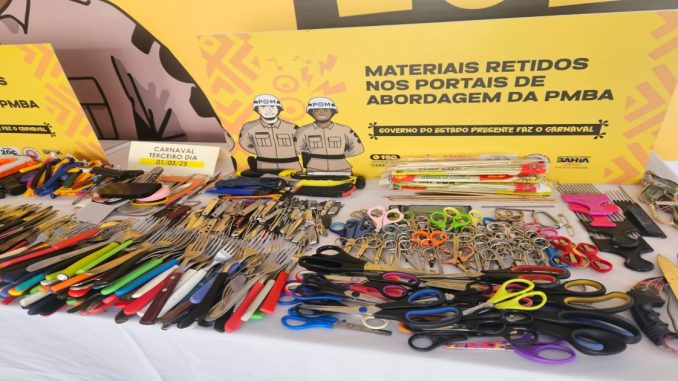 No acumulado de dois dias de festa, 2.057 materiais perfurocortantes já foram retidos nos portais. Entre os objetos, muitos garfos, facas, tesouras, canivetes e algumas réplicas de armas.