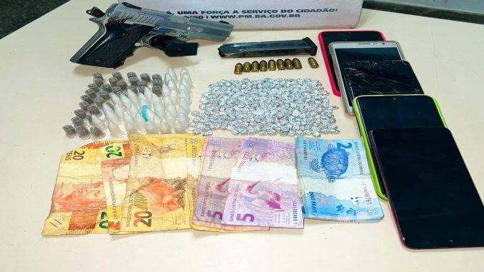 No total foram apreendidos 292 pedras de crack, 31 porções de maconha, 39 pinos de cocaína, cinco celulares, dinheiro e uma pistola com dois carregadores e munições.