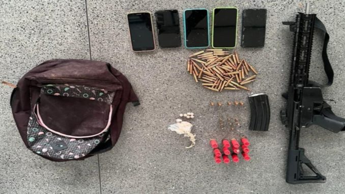 Nesse local, foram localizados um fuzil calibre 9 mm, um carregador, 90 munições com calibres diversos, sete pedras de crack, cinco aparelhos celulares, tendas e roupas camufladas.