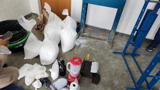No local, além dos 40 quilos de cocaína distribuídos em tabletes e sacos, a Polícia Militar apreendeu diversos equipamentos utilizados no refino da droga, incluindo duas prensas hidráulicas, duas balanças, uma base de prensa com uma chave de fenda, marreta, liquidificador, frascos de vidro vazios, peneiras, bobina de saco plástico e bacias.