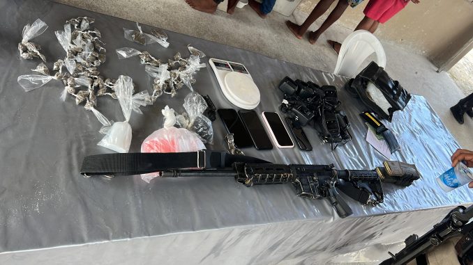 Os policiais seguiram o suspeito até o local onde encontraram quatro indivíduos. No local, foram apreendidos um fuzil calibre .556, 40 munições, 71 frascos de cocaína, 99 porções de maconha, oito carregadores de rádios comunicadores, uma balança de precisão e quatro aparelhos celulares.