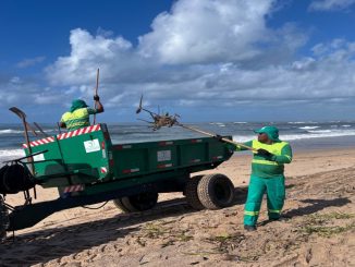 Após o forte período de chuvas que atingiu Camaçari, um mutirão de limpeza foi realizado no sábado (10) na praia de Busca Vida, no distrito de Abrantes. A ação foi coordenada pela Secretaria de Serviços