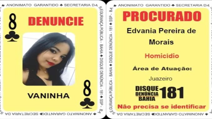 Única mulher entre os 52 nomes do Baralho do Crime da Secretaria de Segurança Pública da Bahia (SSP-BA), Edivania Pereira de Morais, conhecida como Vaninha, está foragida há seis anos. Ela é apontada como mandante do assassinato da professora Élida Márcia de Oliveira, de 32 anos, executada a tiros em fevereiro de 2019, na cidade de Juazeiro. A vítima foi morta na frente do marido e da filha de dois anos, na porta de casa, enquanto se preparava para sair.